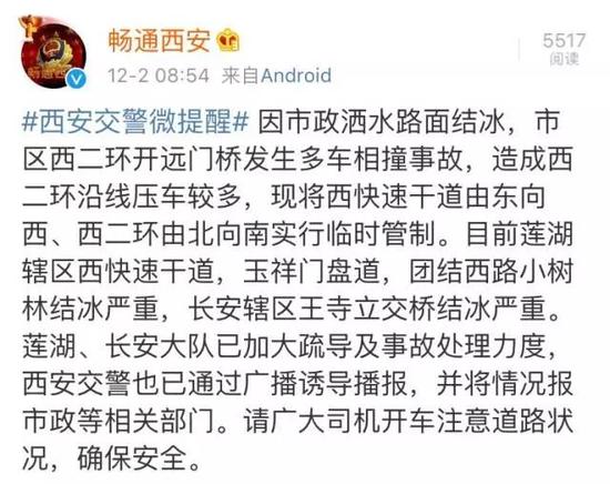 目前蓮湖轄區西快速干道,玉祥門盤道,團結西路小樹林結冰嚴重,長安轄區王寺立交橋結冰嚴重。蓮湖、長安大隊已加大疏導及事故處理力度。請廣大司機開車注意道路狀況,確保安全。