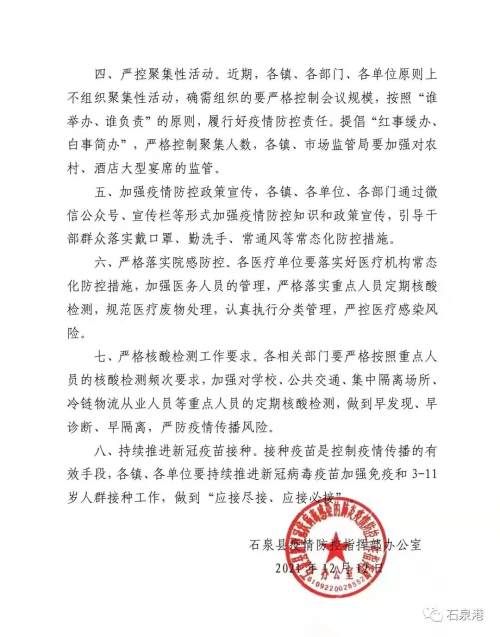 二、加強(qiáng)人員排查管控。從即日起,各鎮(zhèn)、各部門、各單位全面開展本單位干部職工及家屬自11月27日以來西安返石人員情況的排查,督促其迅速向所在社區(qū)報告并做核酸檢測,積極配合村(社區(qū))落實相應(yīng)的疫情防控措施。