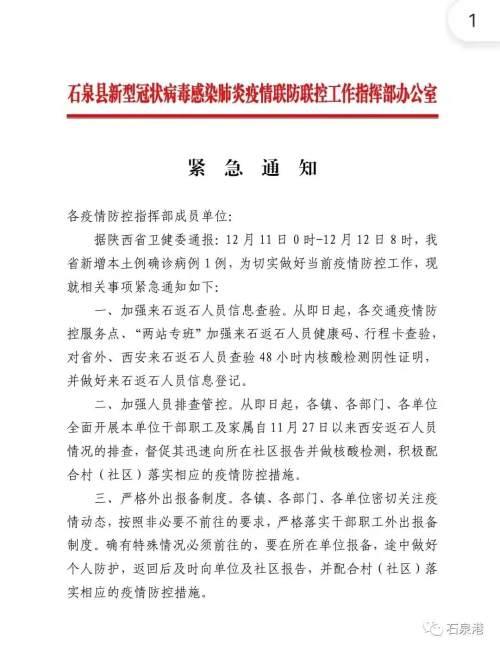 據(jù)陜西省衛(wèi)健委通報:12月11日0時-12月12日8時,我省新增本土例確診病例1例,為切實做好當(dāng)前疫情防控工作,現(xiàn)就相關(guān)事項緊急通知如下: