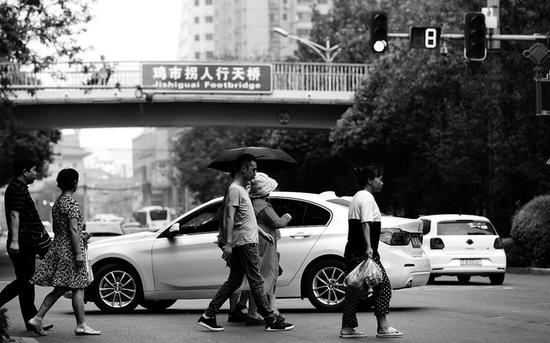 市民橫穿馬路,天橋受“冷遇”本報記者陳飛波攝
