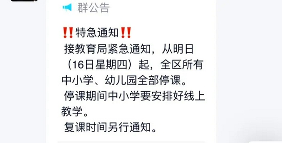 記者了解到,雁塔區多所學校發布通知,今天(12月16日)起,全區所有中小學、幼兒園全部停課。停課期間要求中小學要安排好線上教學。復課時間另行通知。