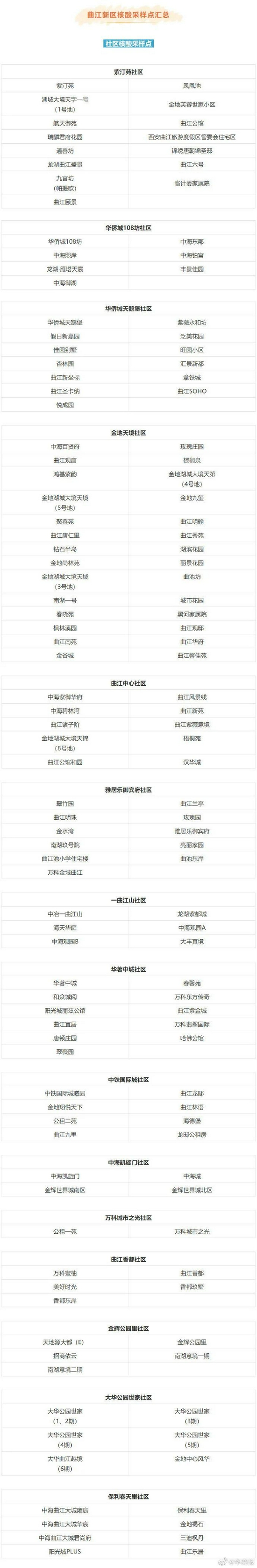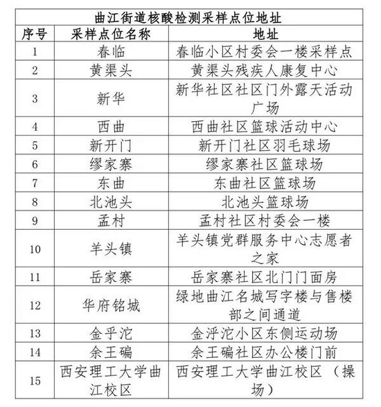 根據疫情防控工作需要,曲江新區新冠肺炎疫情防控指揮部決定即日起在全區范圍開展全員核酸檢測。檢測對象為曲江新區所有居民(包括本地常住人口、暫住人口、臨時流動人口、外籍人口等),不含集中和居家醫學觀察人員。曲江新區核酸采樣點匯總↓↓↓