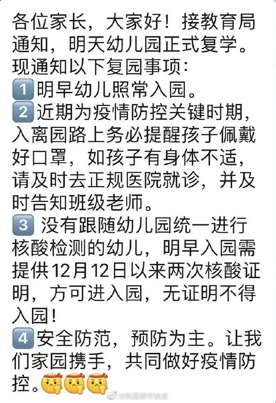 12月15日晚,西安市曲江新區多所學校發出復課通知,在13日—15日停課三天并進行了兩次核酸檢測之后,學校將于12月16日重新恢復正常教學。
