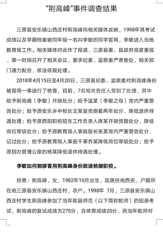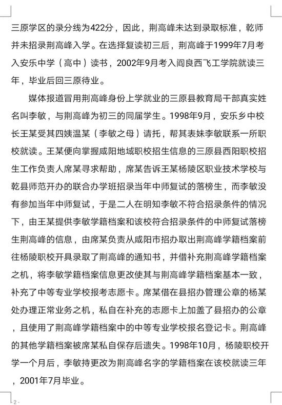 1998年7月,在三原縣安樂鎮學生荊高峰參加了當年乾縣師范招錄考試,但沒有考上。復讀后的第二年,荊高峰在1999年7月考上了安樂中學(高中),2002年9月考入閻良西飛工學院就讀三年,畢業后回三原待業。荊高峰當年并未考上乾縣師范,由此判斷,不存在“擠掉”名額一說。