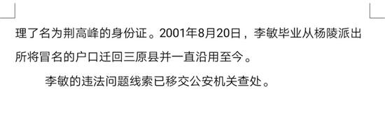 1998年,農村戶口由當地鄉政府辦公室管理。當年6月至11月間,安樂鄉政府辦公室人員未曾受理過李敏冒用的荊高峰因就學遷移戶口事宜,也沒有找到任何戶口遷移存根資料。李敏于1998年11月1日在她上學地管轄派出所(楊陵派出所)以荊高峰名字落戶。上學期間,李敏辦理了名為荊高峰的身份證。2001年8月20日,李敏畢業從楊陵派出所將冒名的戶口遷回三原縣并一直沿用至今。