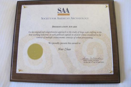 當日的頒獎儀式由美國考古學新任主席喬伊。沃特金斯宣布獲獎人名單,并由即將離任的美國考古學會主席蘇珊。錢德勒為獲獎者頒授獎牌。趙昊博士所獲獎牌上的嘉獎詞為:為表彰其將中國古代早期都邑中心內大規模制骨手工業置于多維度城市供給背景而進行的開創性與綜合性的研究方式,我們驕傲地將美國考古學會最佳博士論文獎授予:趙昊。
